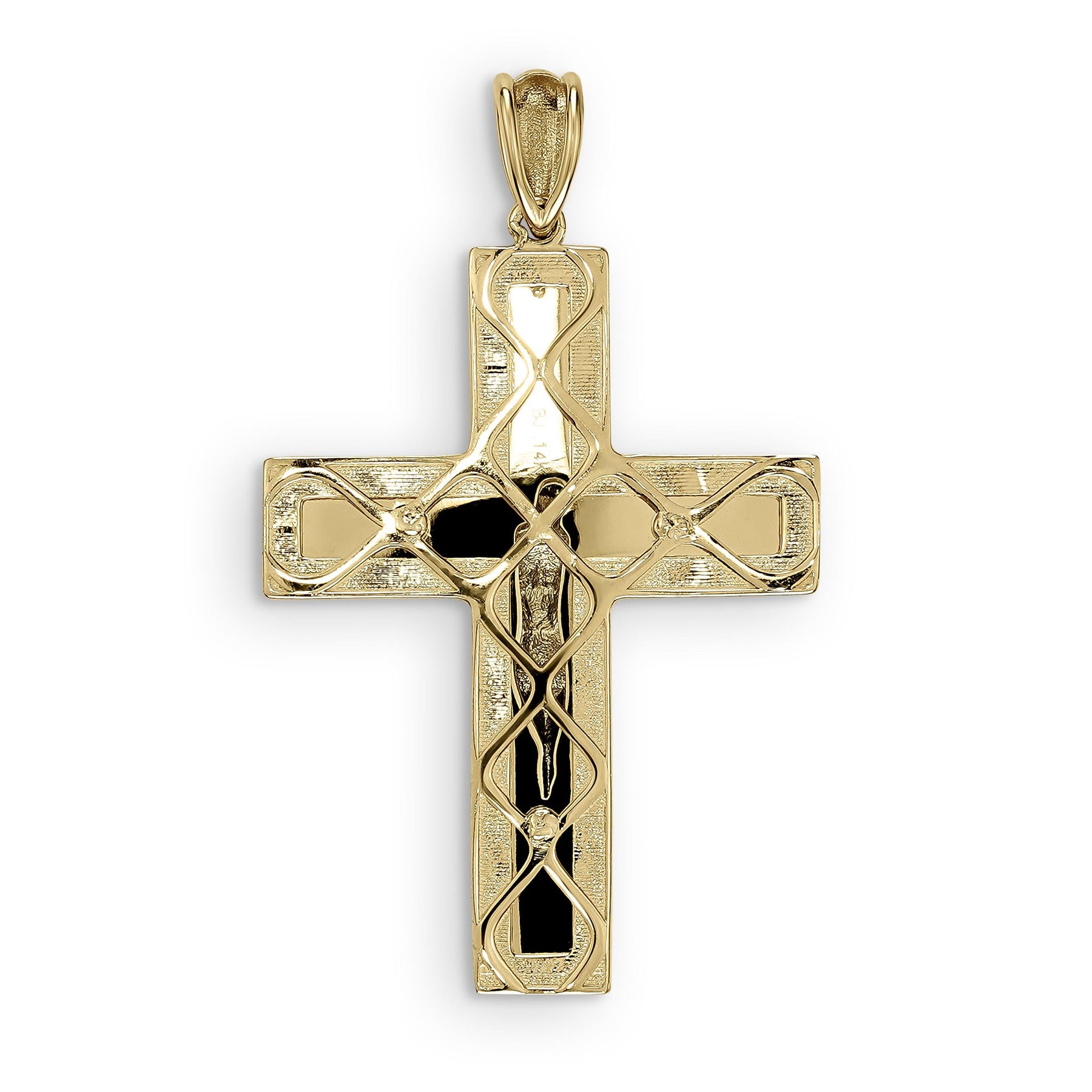 Crafted from genuine yellow and white gold, this exquisite piece features a striking Jesus crucifix set against a vintage nugget-style cross, combining timeless elegance with modern flair. The high-polished finish ensures that it catches the light beautifully, making it a standout addition to any outfit.