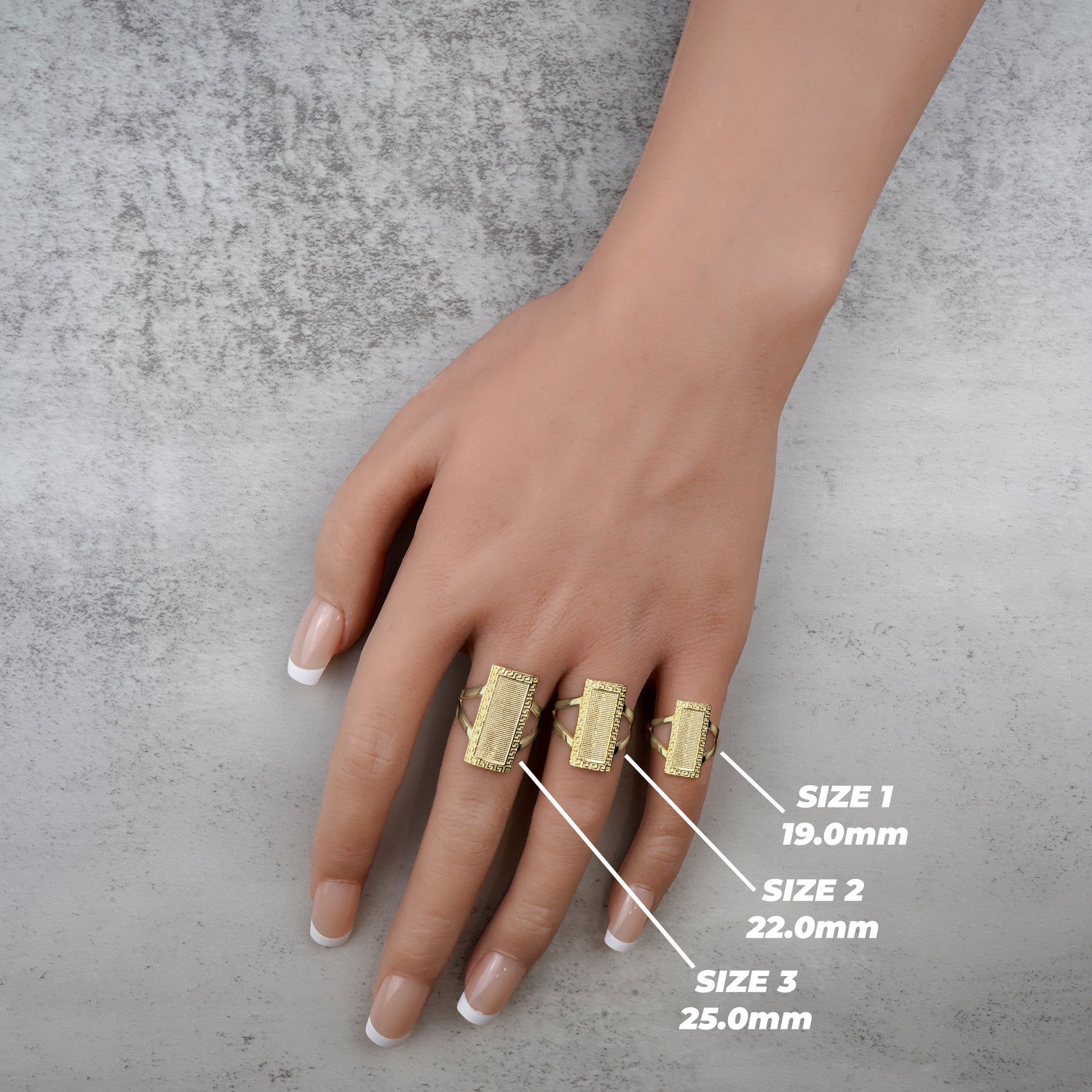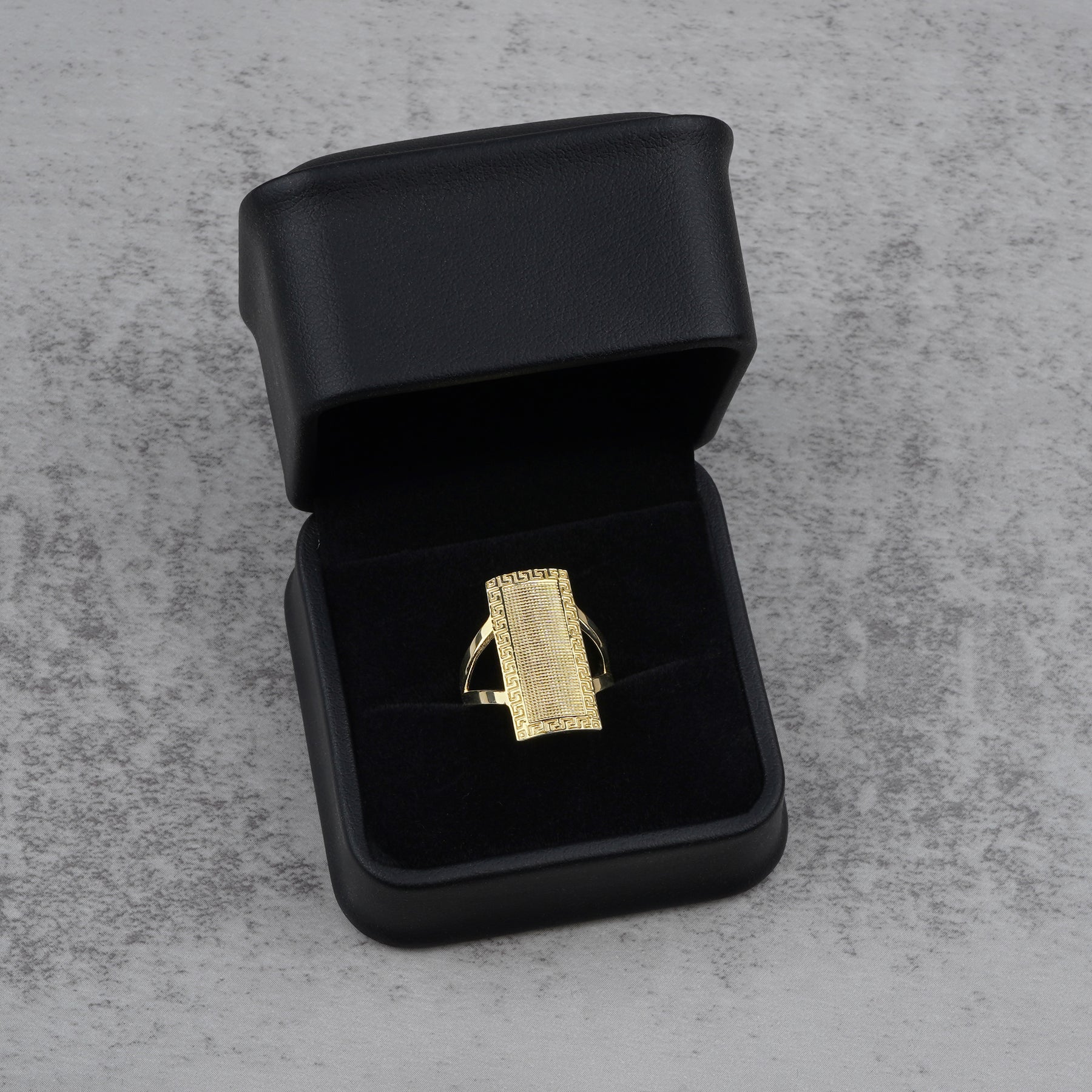 Make a bold statement with this solid gold rectangular ring featuring a detailed Greek key border and textured center panel. Designed for those who love strong, eye-catching jewelry, this piece delivers a clean, powerful look while maintaining refined craftsmanship.