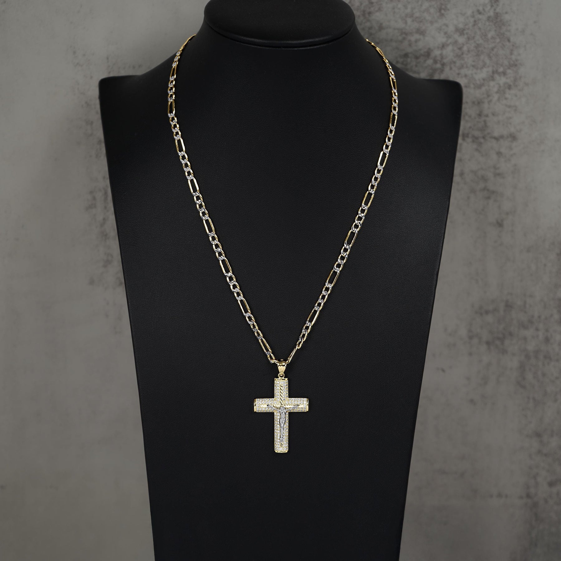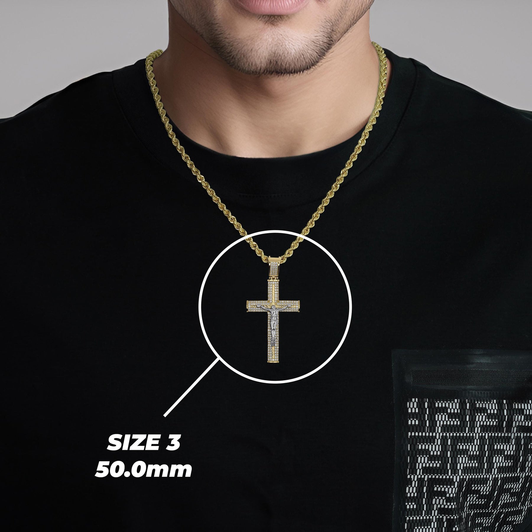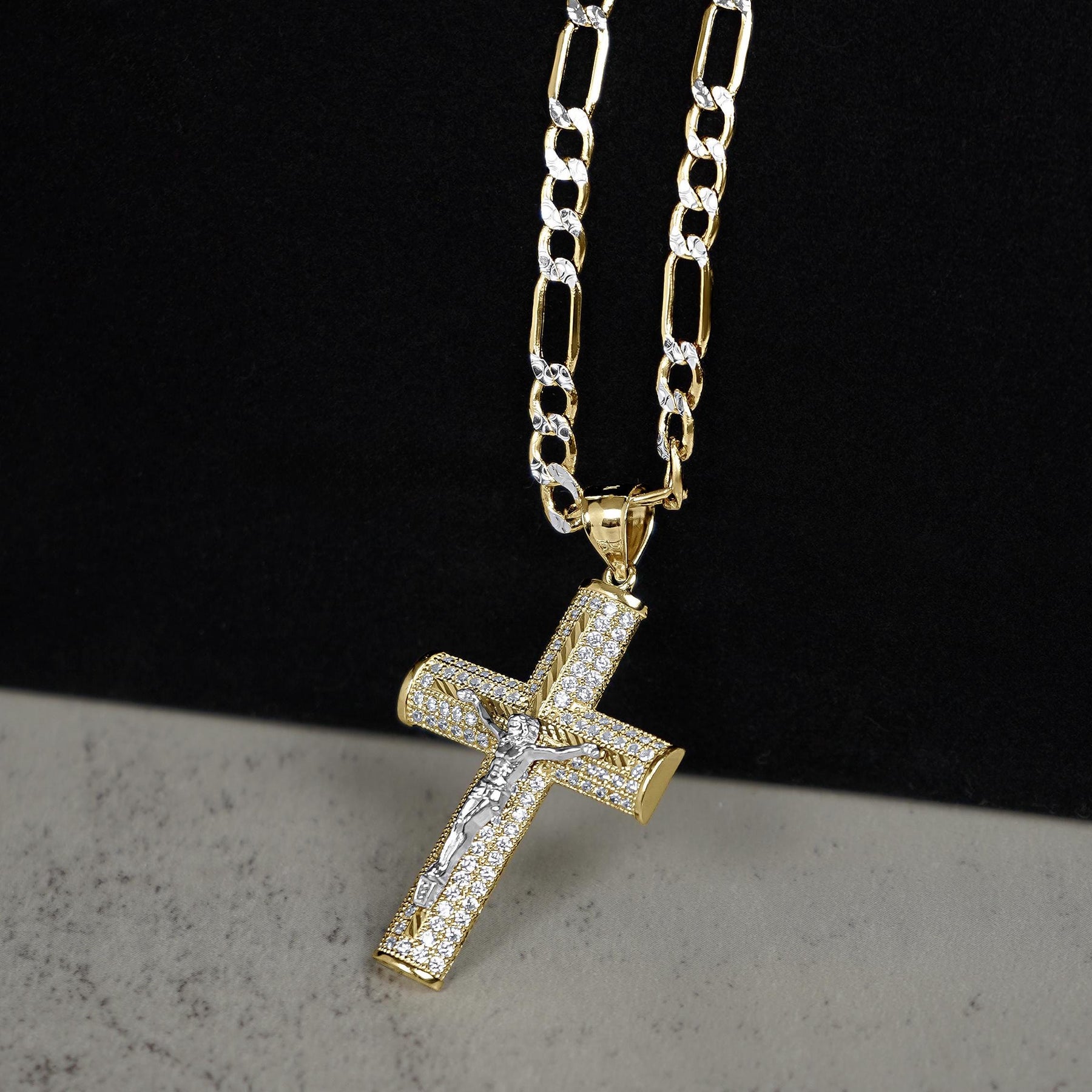 Crafted from genuine yellow and white gold, this stunning piece features an intricately designed iced-out cross with diamond cut line throughout the cross adorned with dazzling cubic zirconia, ensuring it sparkles brilliantly in any light. The striking contrast of the white gold figure of Jesus enhances its visual appeal, making it a standout accessory that captures attention.