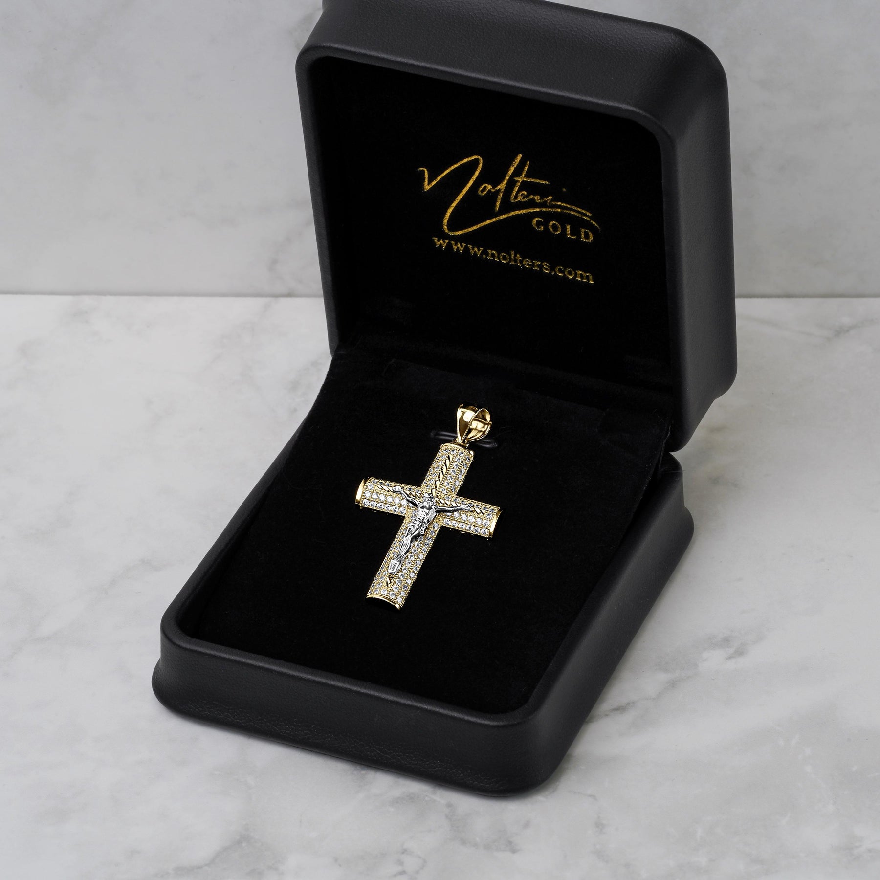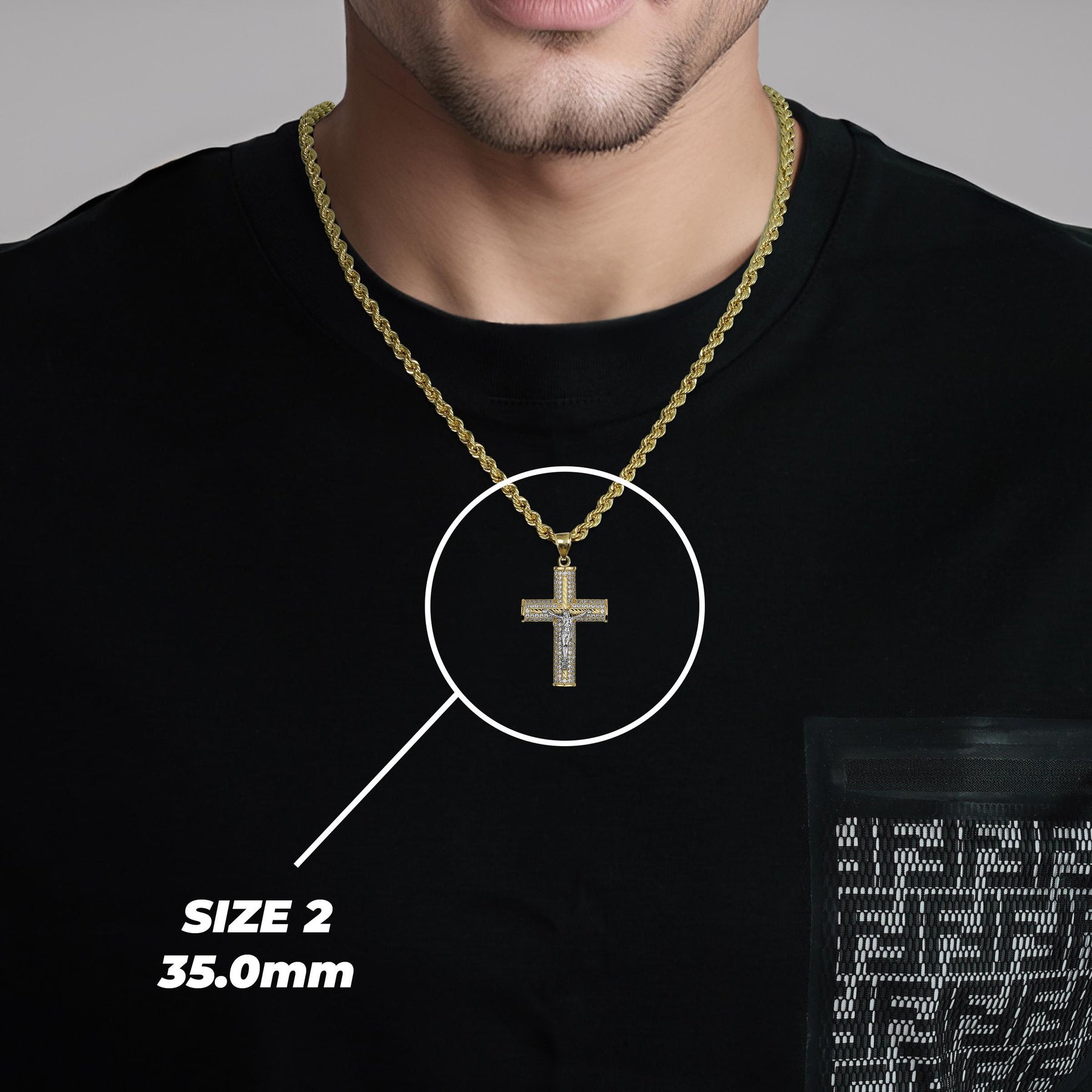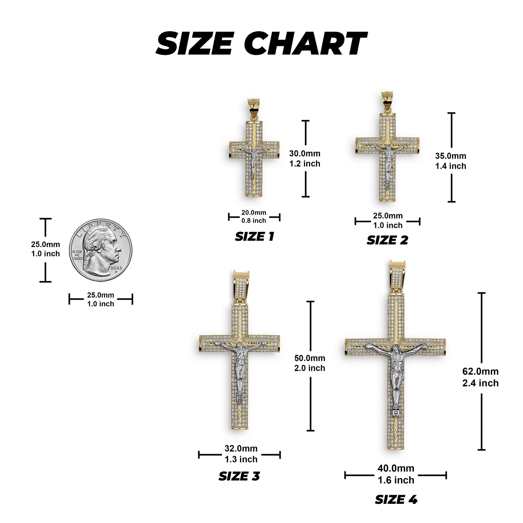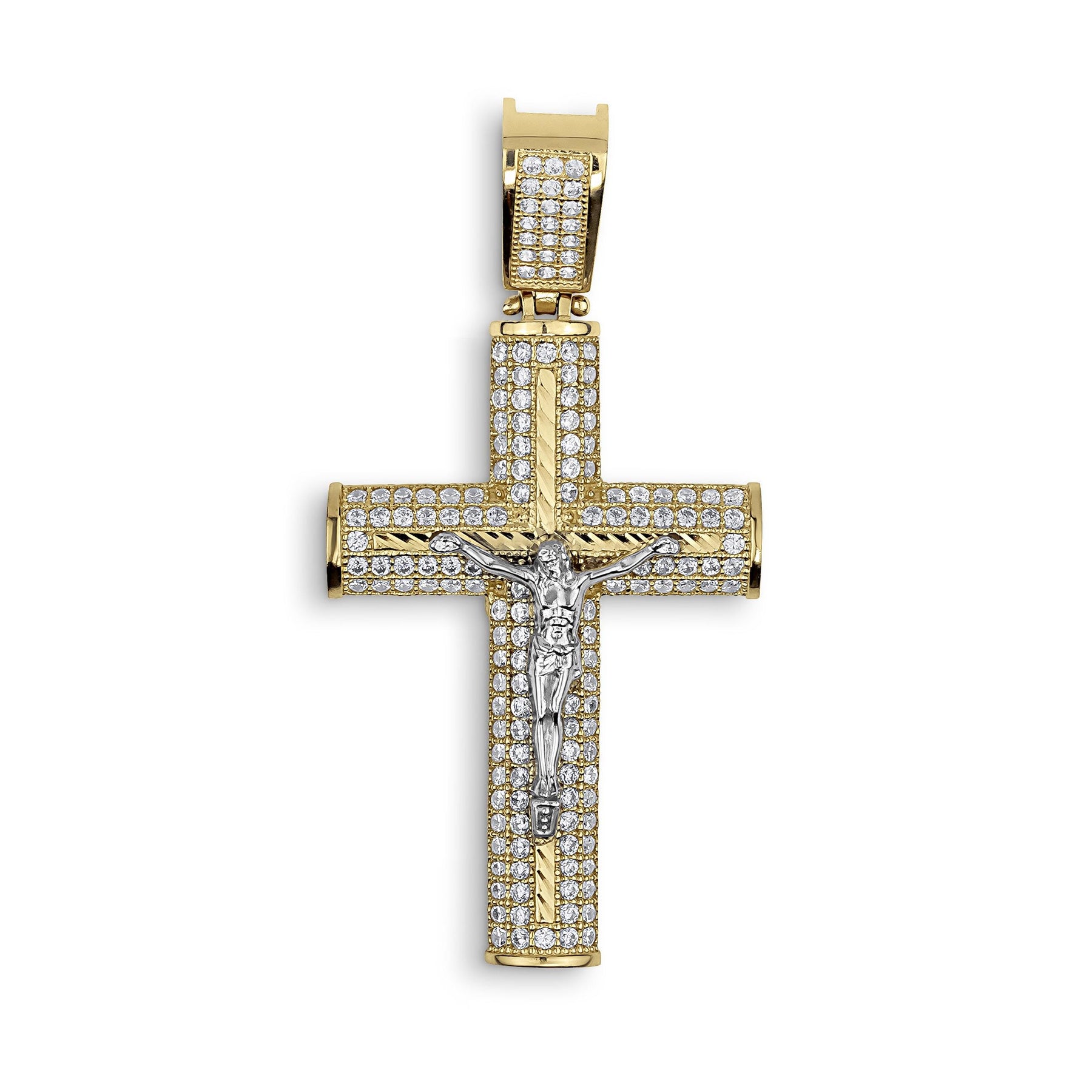 Crafted from genuine yellow and white gold, this stunning piece features an intricately designed iced-out cross with diamond cut line throughout the cross adorned with dazzling cubic zirconia, ensuring it sparkles brilliantly in any light. The striking contrast of the white gold figure of Jesus enhances its visual appeal, making it a standout accessory that captures attention.