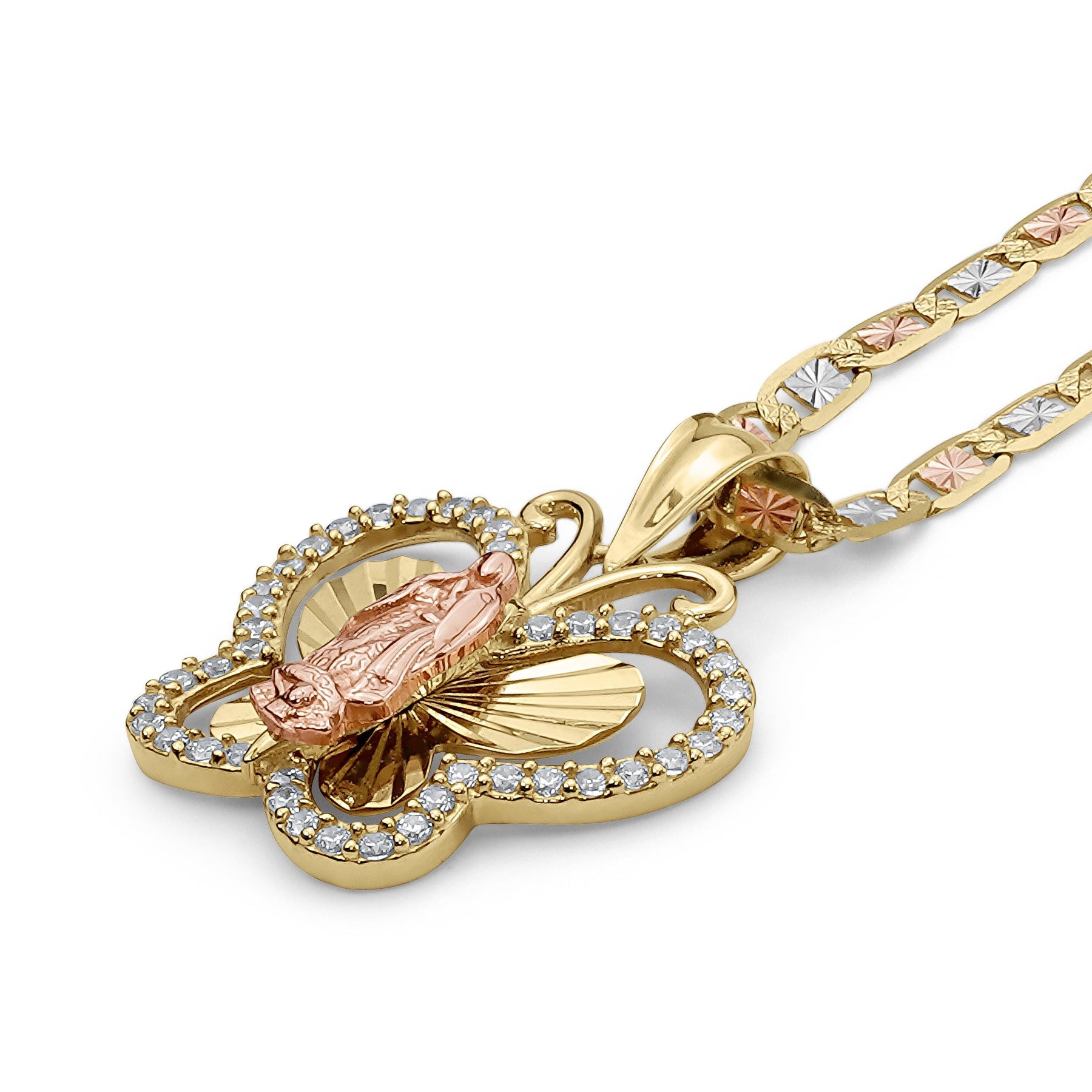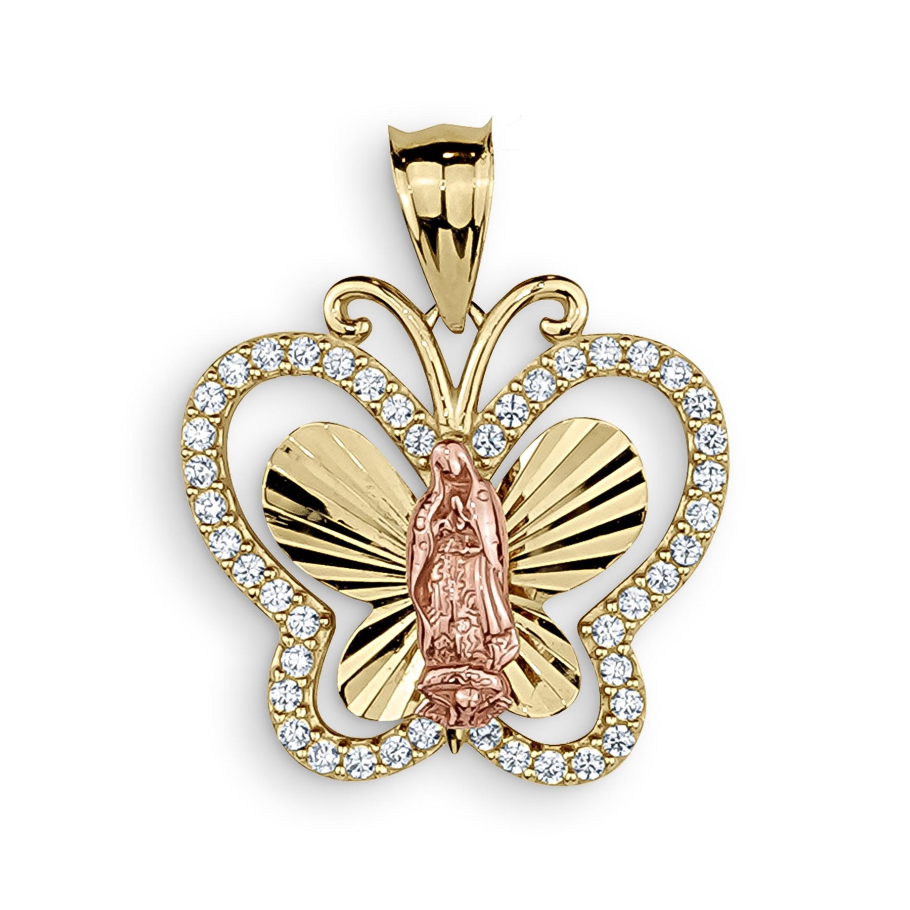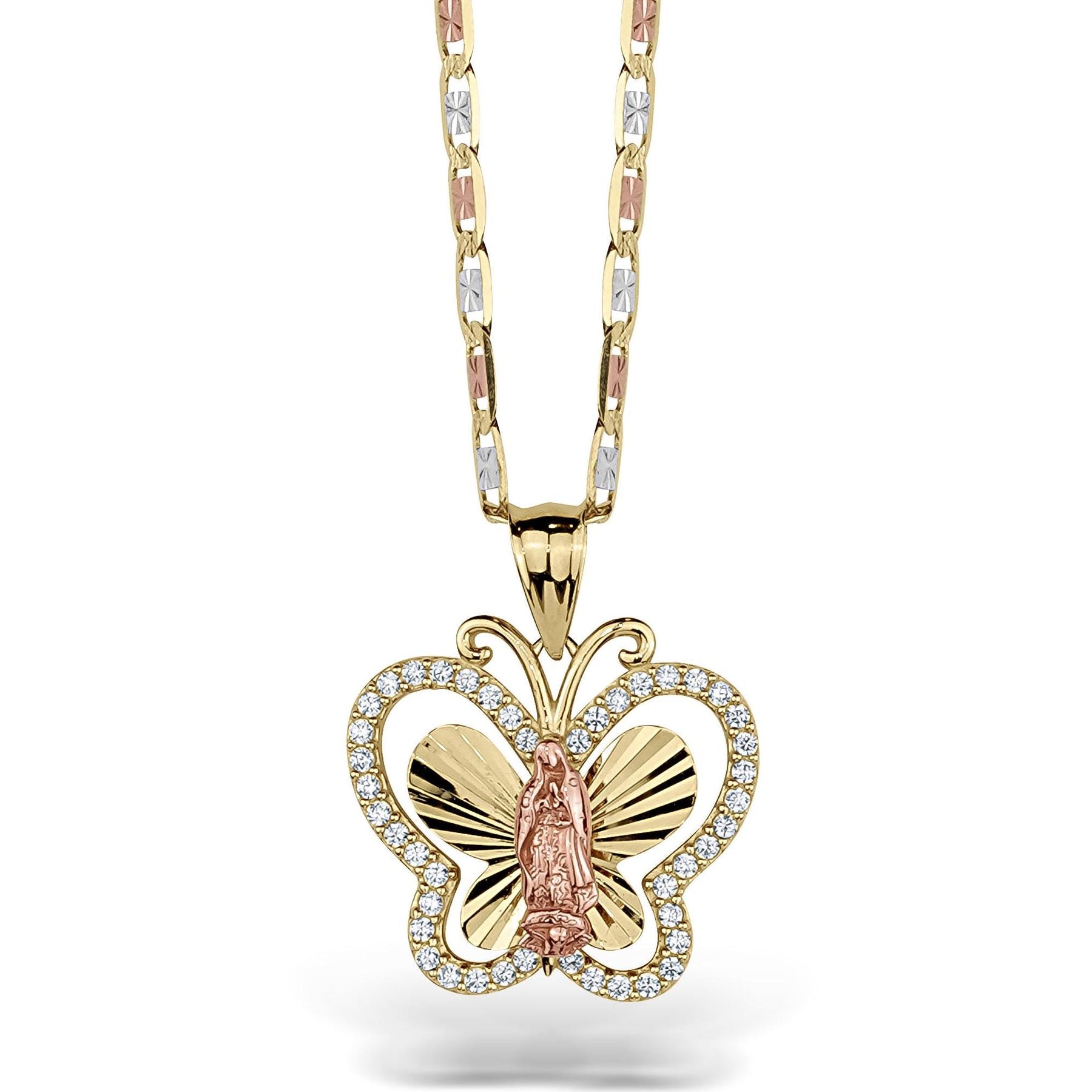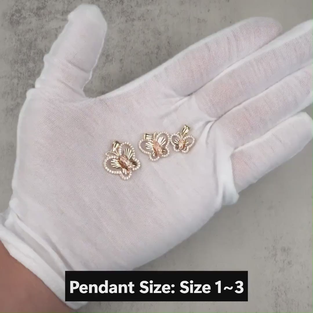 10k & 14k Gold Leir Virgin Mary Guadalupe Butterfly CZ Pendant Necklace