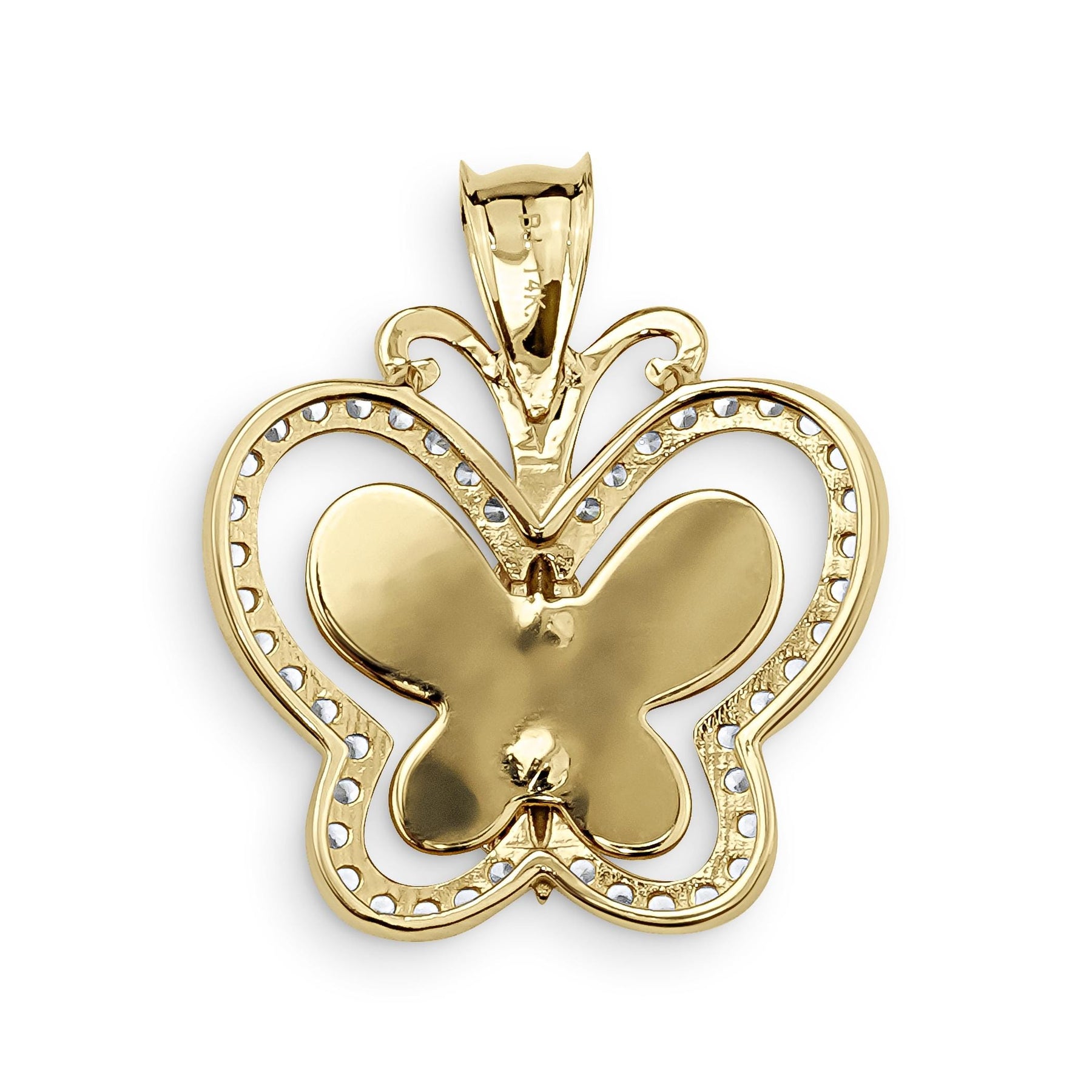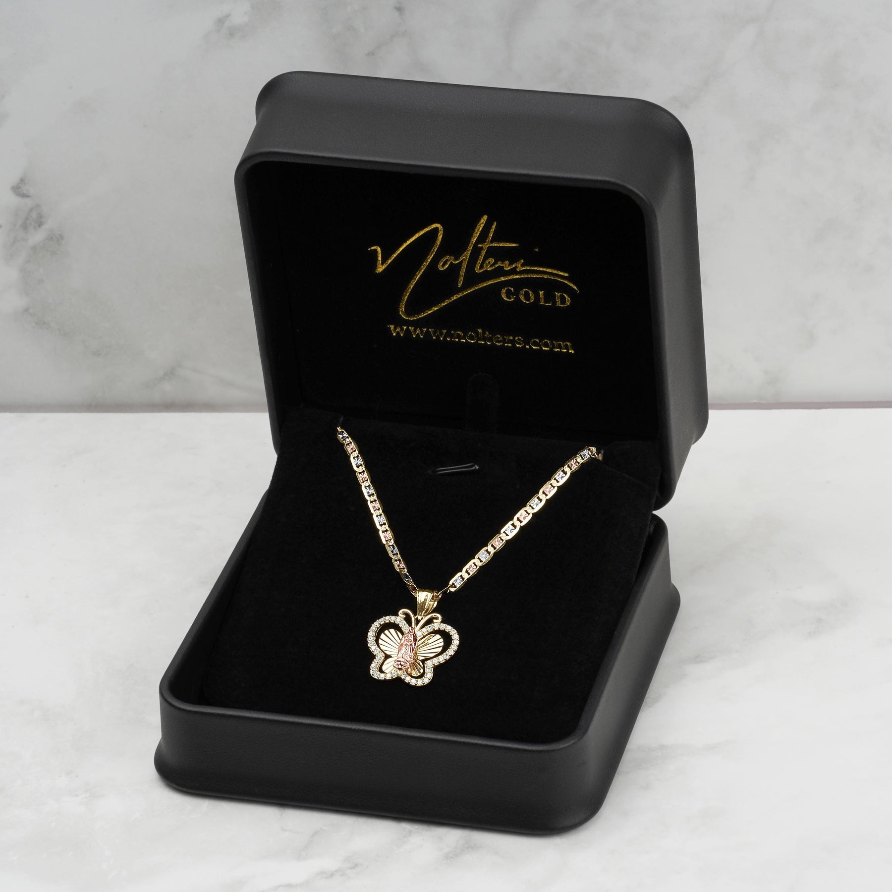 Elevate your jewelry collection with the exquisite 10k & 14k Gold Leir Virgin Mary Guadalupe Butterfly CZ pendant. Crafted from genuine yellow and rose gold, this stunning piece features a beautifully detailed Virgen de Guadalupe at its heart, symbolizing faith and devotion. Adorned with shimmering cubic zirconia that gracefully encircle the butterfly, each ring dazzles with elegance.