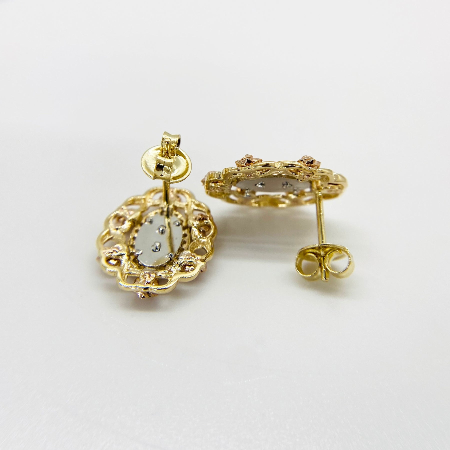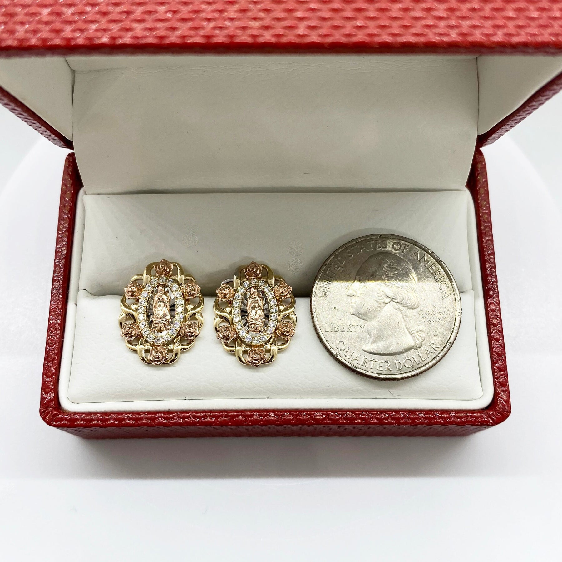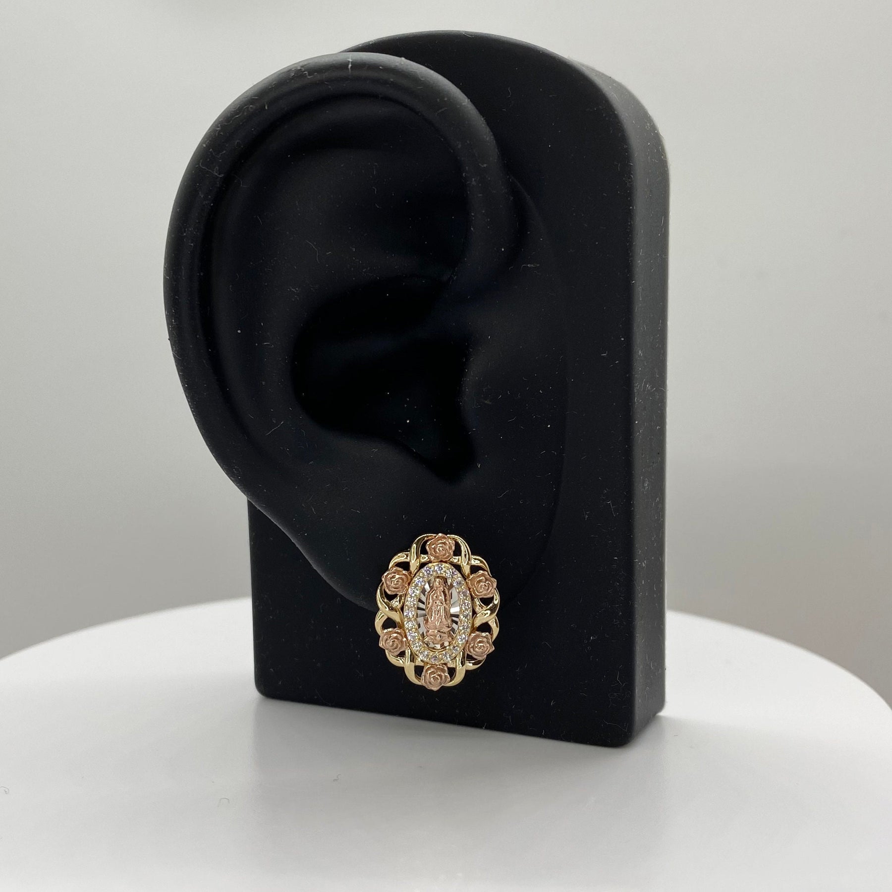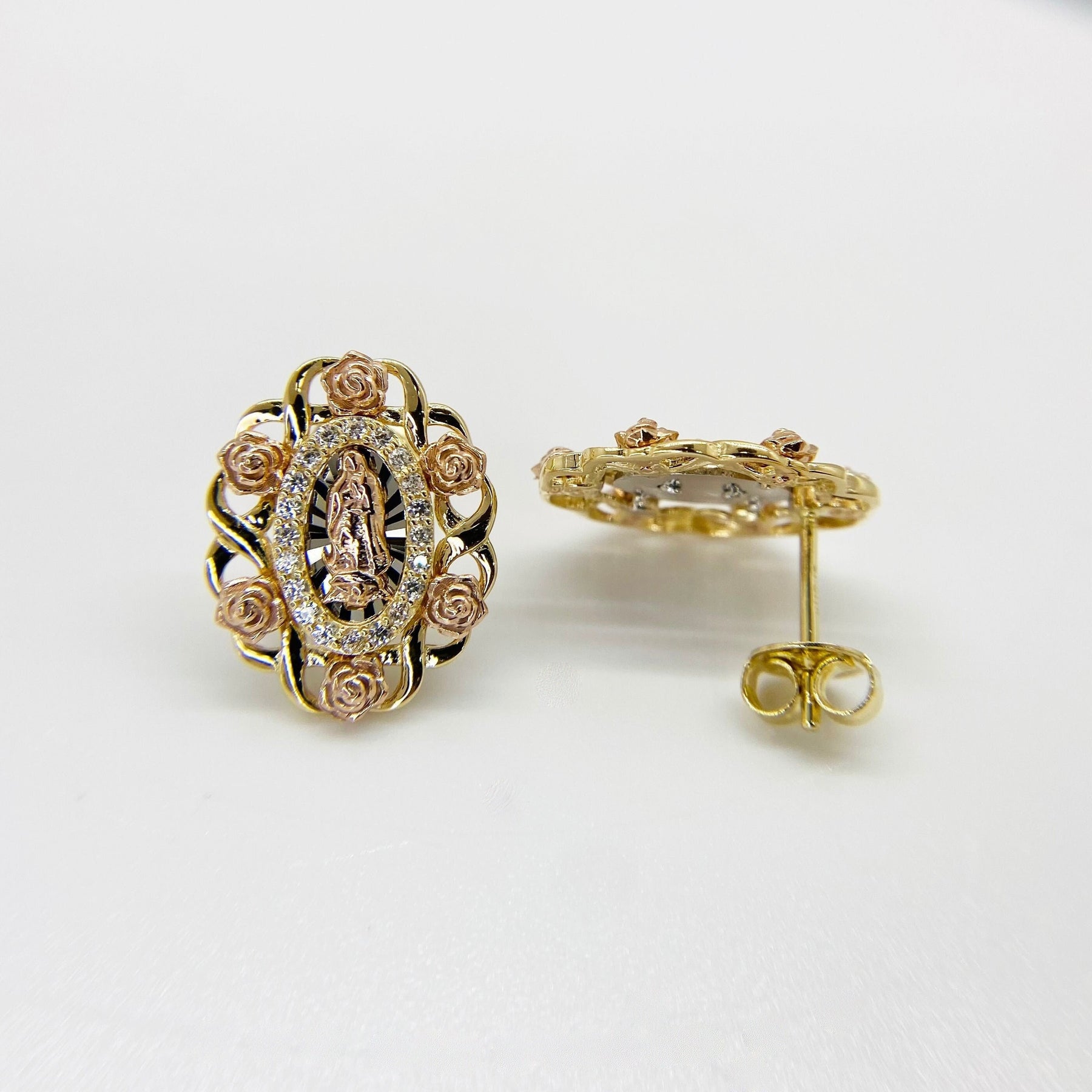 10k & 14k Gold Virgin Mary Guadalupe Bloom Rose Tri-Color Oval Stud Earrings
