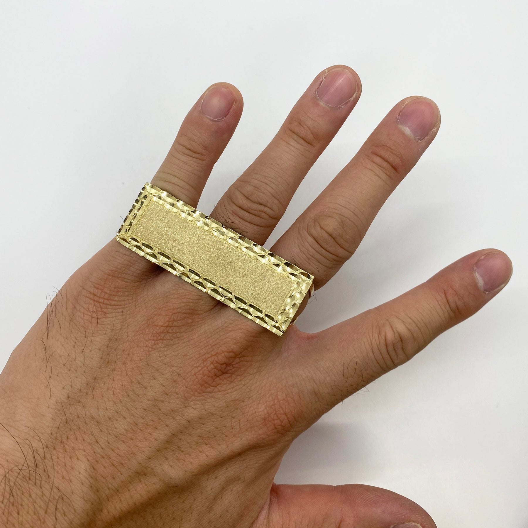 Experience the bold style of our 10k Solid Gold Three Finger Plate Diamond Cut Classic Ring II, designed for both men and women. This unique ring features an eye-catching diamond cut finish that reflects light beautifully, making it a standout piece in any jewelry collection. Crafted from high-quality solid gold, it offers durability and a luxurious feel. Perfect as a gift for special occasions or a statement piece for everyday wear. Embrace individuality with this striking ring that blends modern design and timeless appeal.