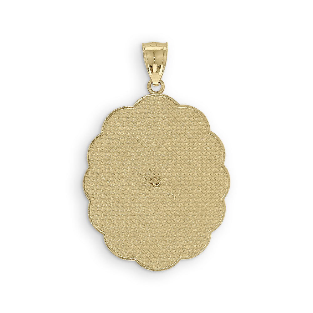 Crafted from real 10k & 14k yellow, white, and rose gold with a stunning diamond cut finish frame, this pendant features a Virgin Mary Guadalupe design with NTRA. SRA. DE GUADALUPE writing. Available in four sizes to suit any preference, this pendant makes for a perfect gift for her on any special occasion. Add a touch of elegance and sophistication to your look with this timeless piece of jewelry that will surely turn heads wherever you go.