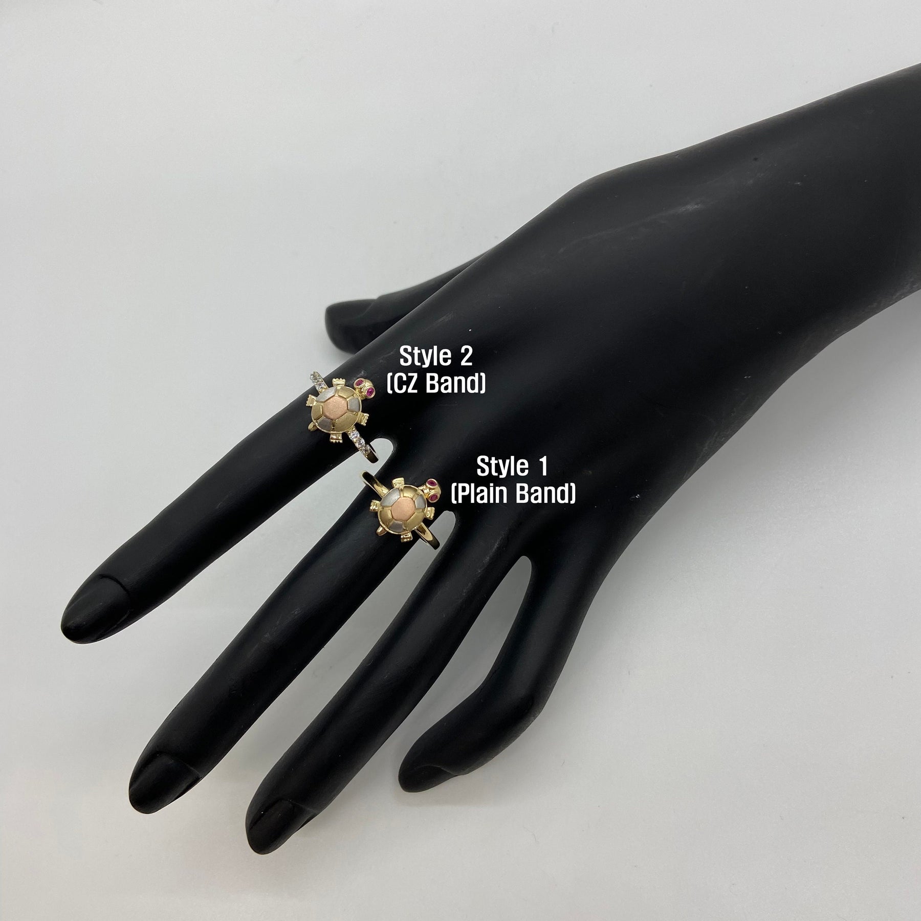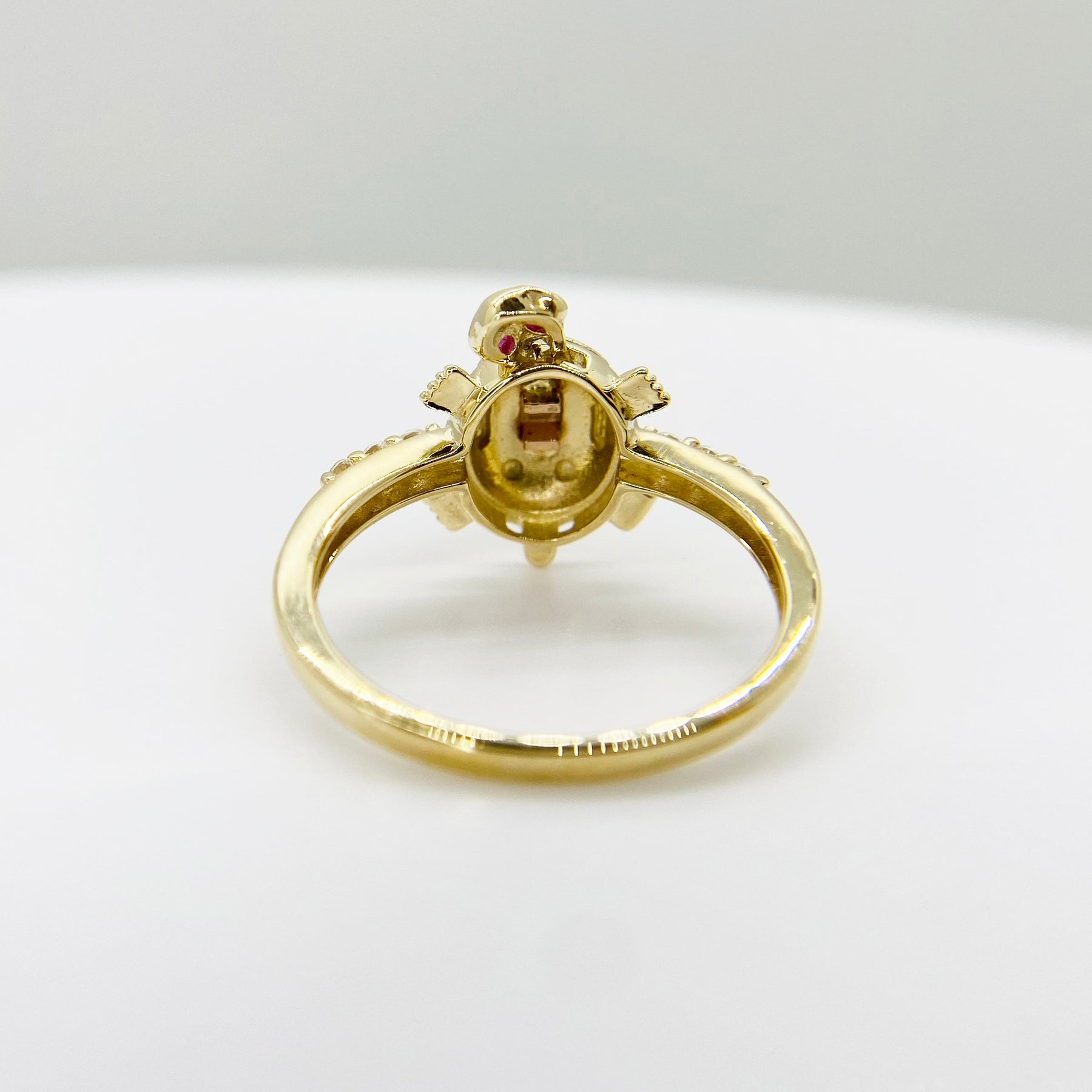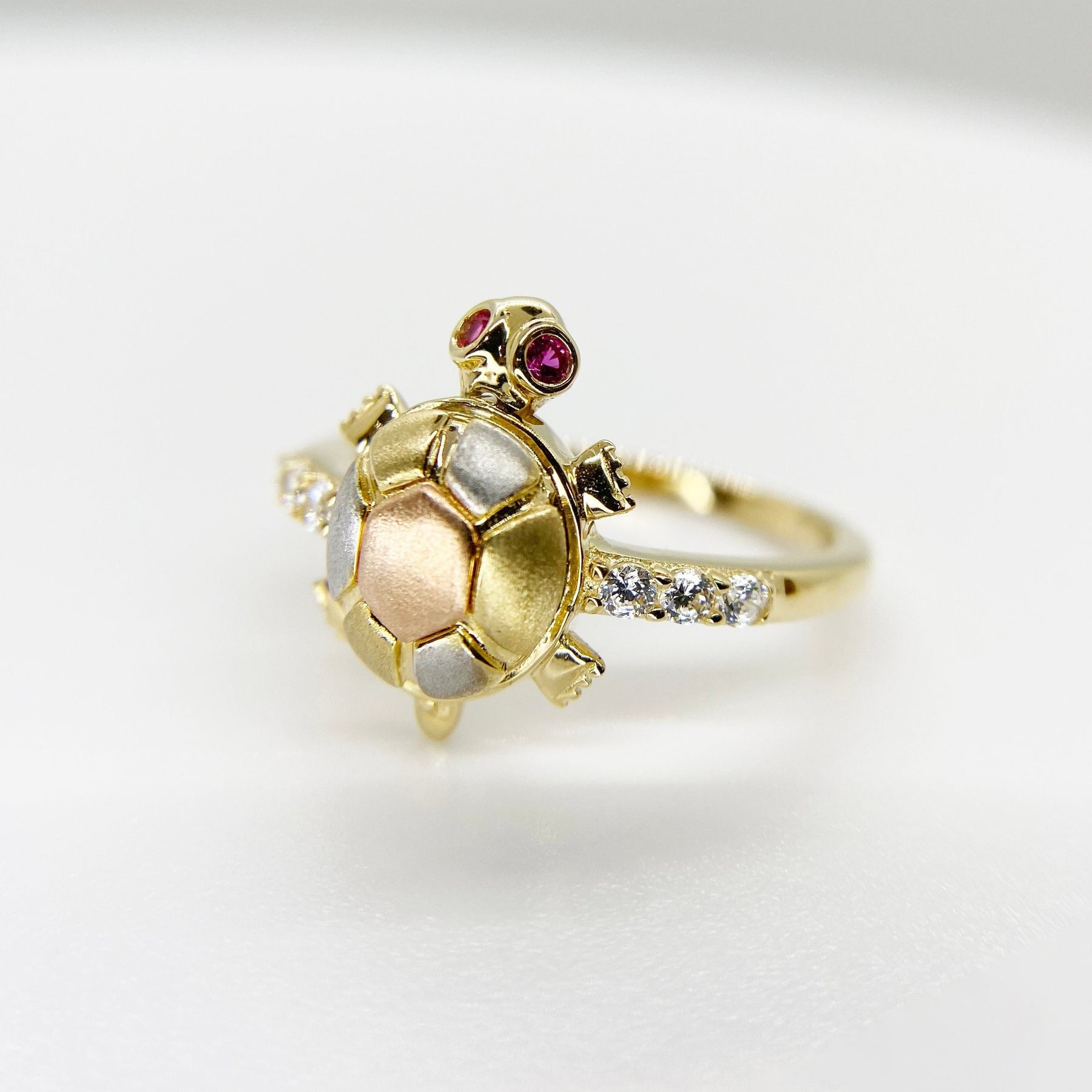 Show off your unique style with this 14k Solid Gold Turtle Ring, featuring red tourmaline tri-color eyes and a moving head. The lucky CZ accents add a touch of sparkle to this charming piece. Perfect for women and girls, this ring blends sophistication with whimsy. Ideal for everyday wear or special occasions, it symbolizes good fortune and individuality. Enhance your jewelry collection with a statement piece that combines elegance with a playful twist.