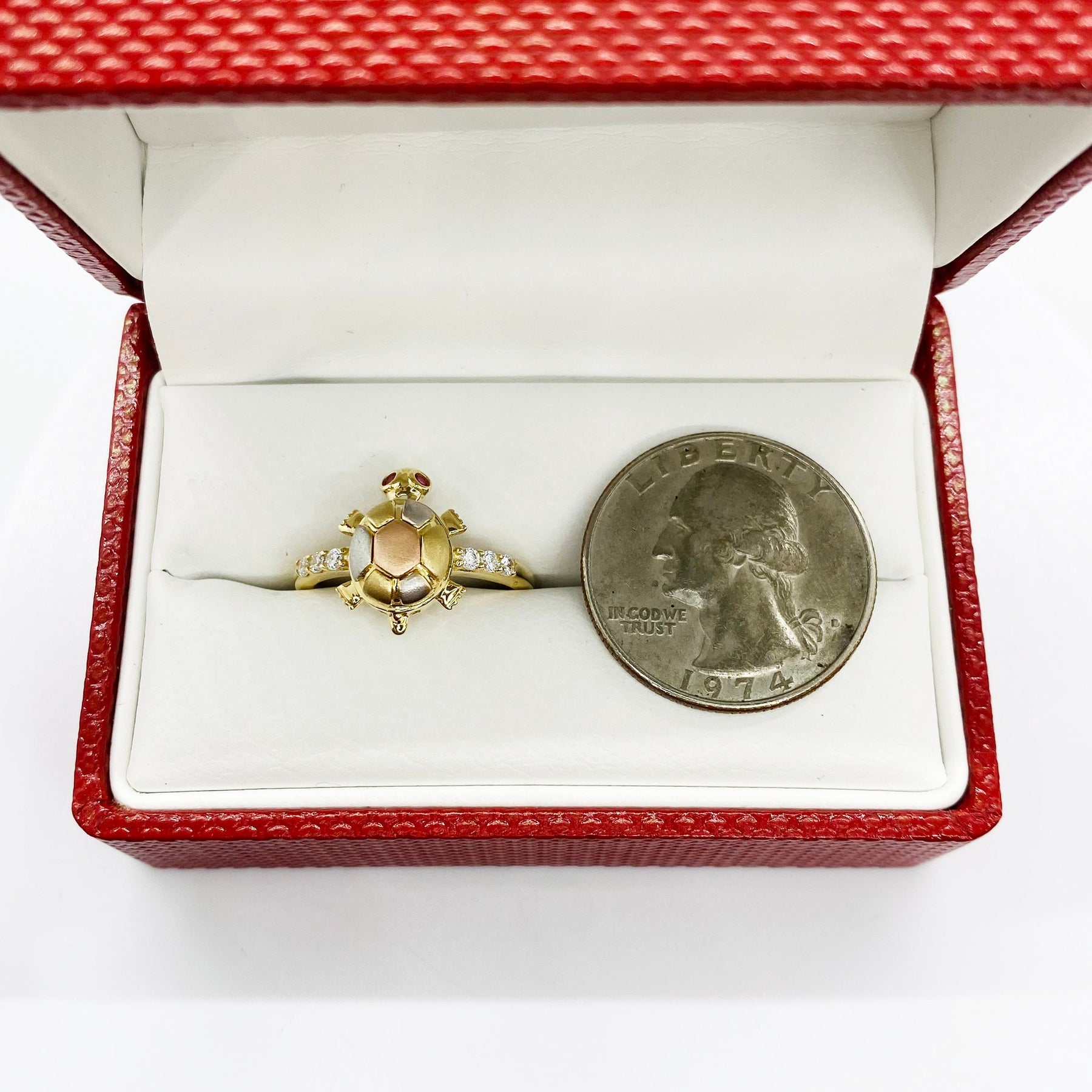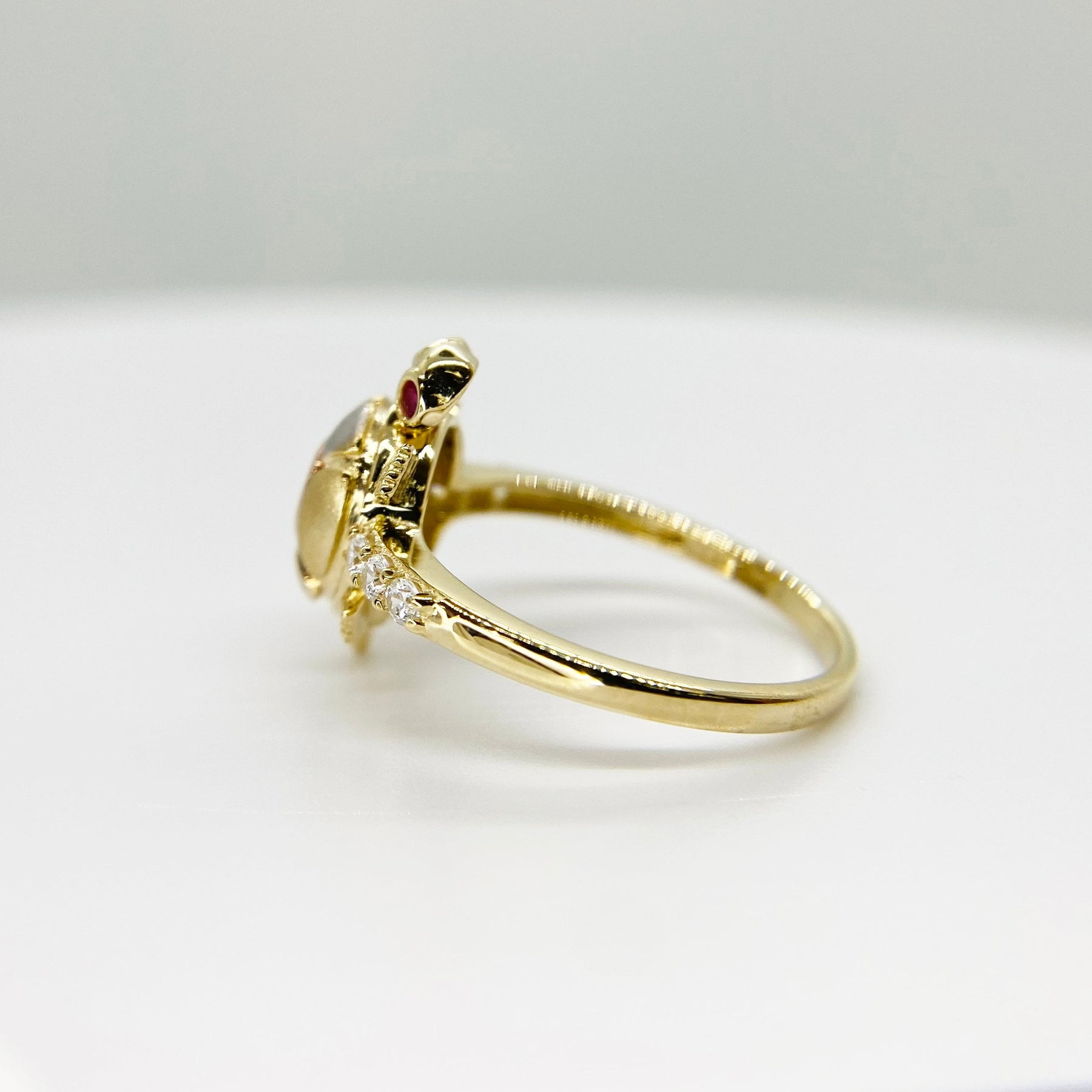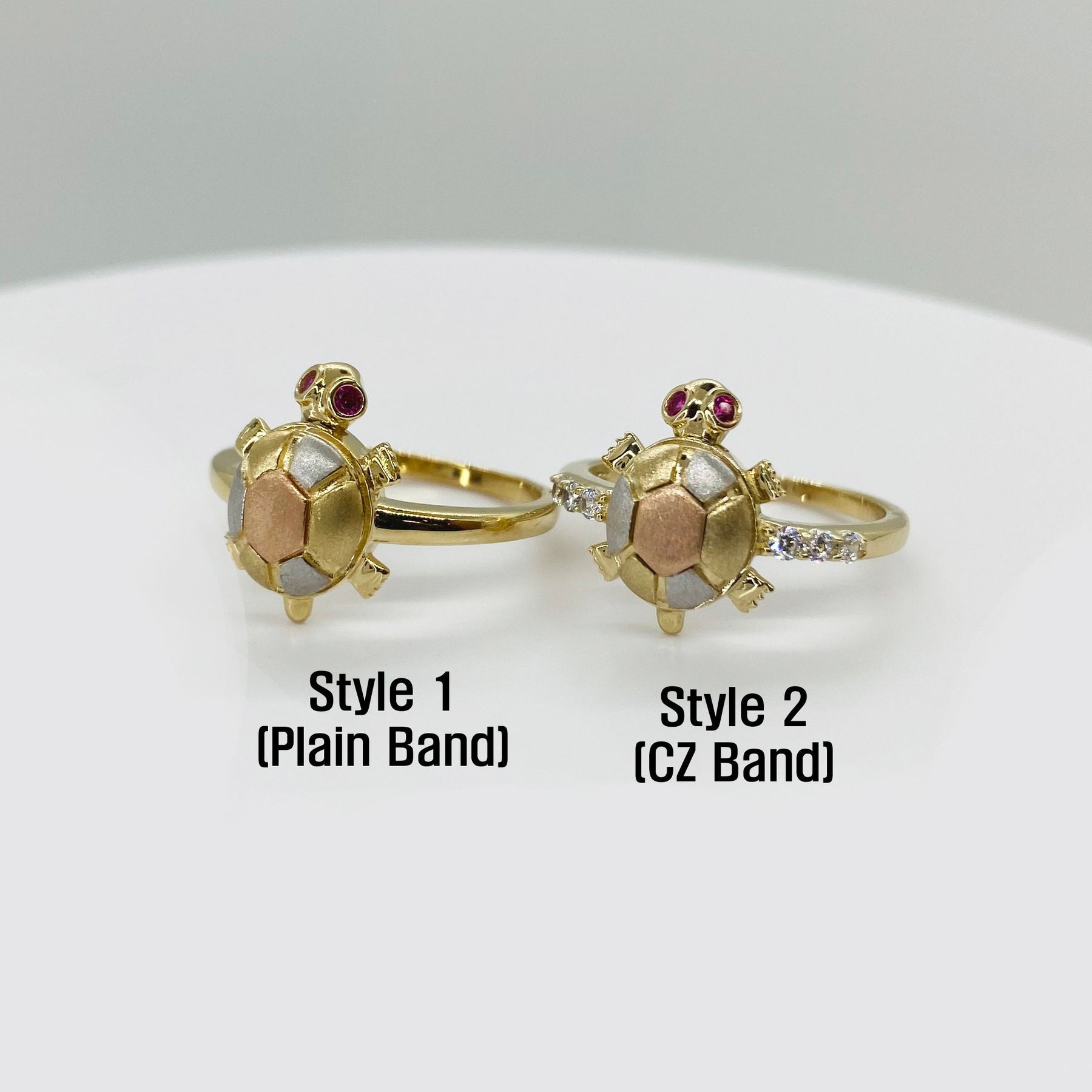 Show off your unique style with this 14k Solid Gold Turtle Ring, featuring red tourmaline tri-color eyes and a moving head. The lucky CZ accents add a touch of sparkle to this charming piece. Perfect for women and girls, this ring blends sophistication with whimsy. Ideal for everyday wear or special occasions, it symbolizes good fortune and individuality. Enhance your jewelry collection with a statement piece that combines elegance with a playful twist.